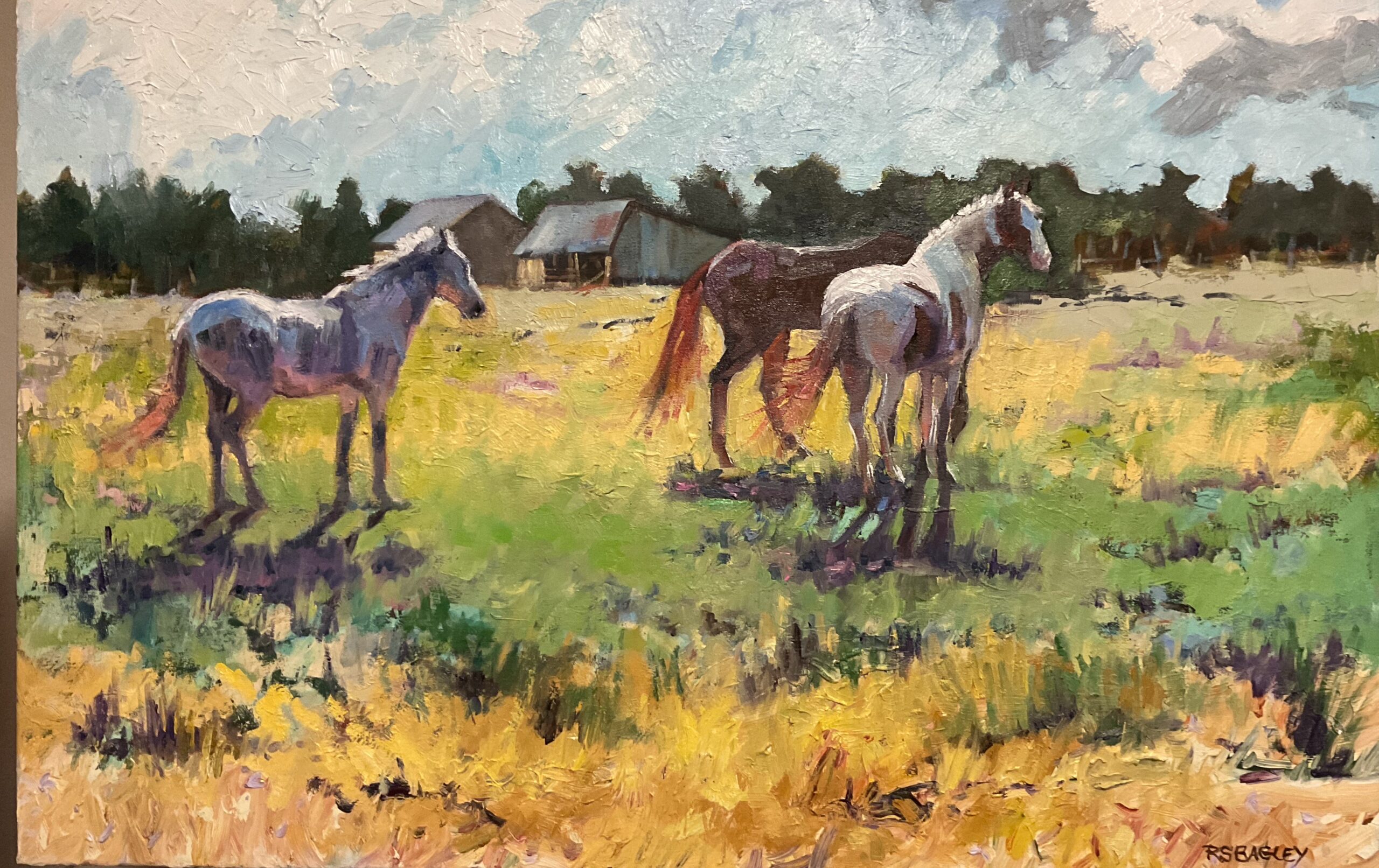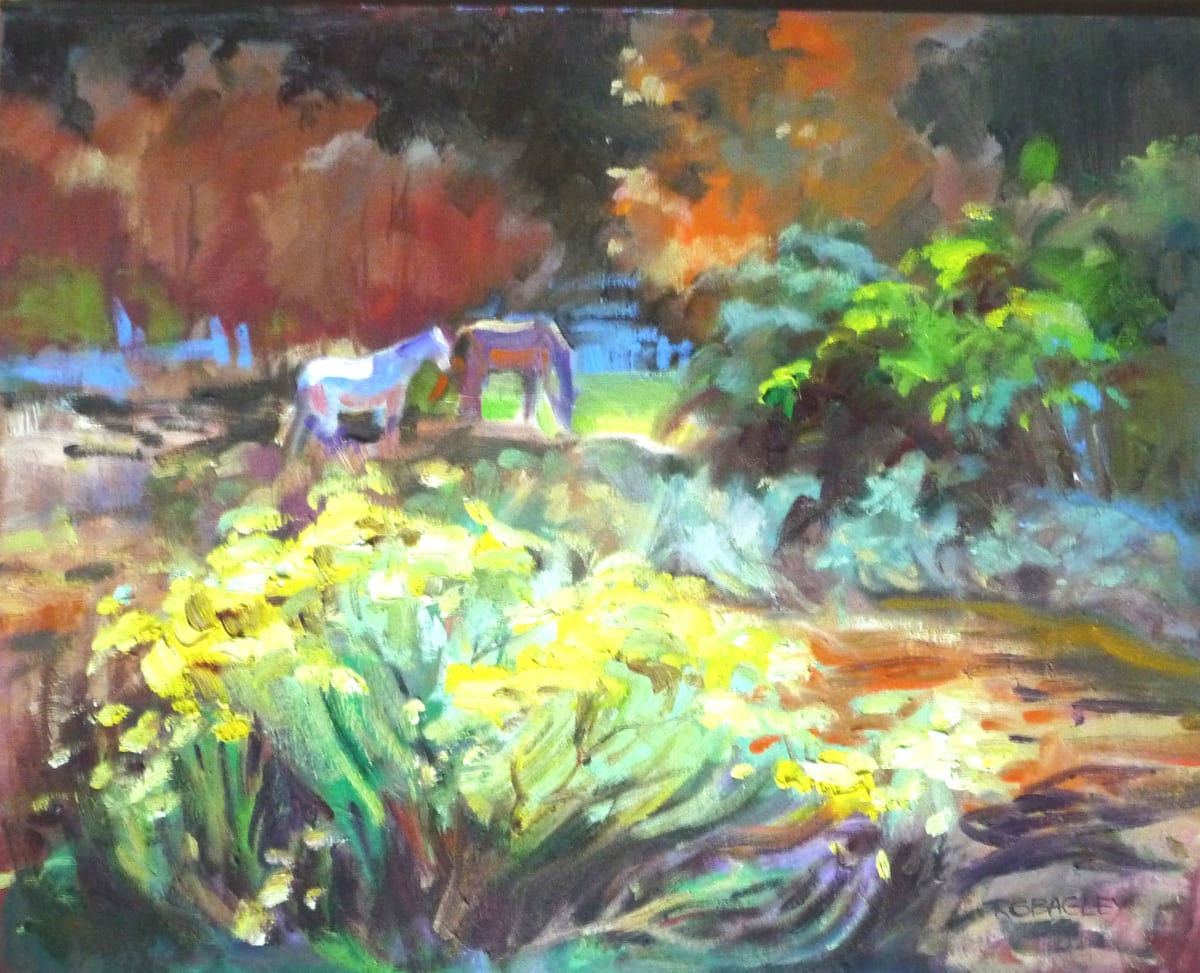 Ramona Stafford Bagley has won many awards for her painting and drawing abilities both in the eastern states where she produced fine watercolors and illustrations, to the Southwest where she found oils and the practice of Plein Aire Painting to attract her. She has joined her own flair with an impressionist style drawn from that of artists earlier in this century. She found wonderful teachers among the famous Taos Six and it was through them that, 20 years ago, she learned the art of Plein Aire Painting and oils. The colors present in the enchanting Southwest landscape are delightfully put to canvas with vibrant painterly strokes which characterize her work. Many of her paintings express a charming and soothing quality and she has a special talent with the elements of water and the animal world. She has recently opened a Gallery attached to the New “Angel Fire Water” building and named It “the Water Works Gallery” it is located at 28 Fria Court which is just off the Blinking Light leading into Angel Fire.
